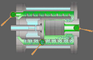 物料隨著進(jìn)料泵由頂端進(jìn)入研磨腔,隨著轉(zhuǎn)子的旋轉(zhuǎn)而均勻分布,在轉(zhuǎn)子和定子縫隙內(nèi)渦流離心力的作用下對物料進(jìn)行了徹底的預(yù)分散處理。在接下來強(qiáng)烈的研磨中,轉(zhuǎn)子棒銷和定子對研磨介質(zhì)連續(xù)發(fā)生劇烈的撞擊變化,研磨介質(zhì)再作用于物料,物料得以研磨,研磨后的物料在研磨腔停留時(shí)間特別短,從而得到一個(gè)極窄的產(chǎn)品粒度分布帶,在進(jìn)料泵壓力和離心力作用下,由于密度的不同,研磨介質(zhì)返回研磨腔,物料卻沿著離心力相反的方向經(jīng)動(dòng)態(tài)分離器過濾分離,循環(huán)往復(fù)。
