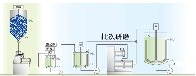 主要方式:固態(tài)顆粒在分散釜內(nèi)攪拌或分散一定時(shí)間后,經(jīng)過充分潤(rùn)濕通過進(jìn)料泵投入到研磨腔中,為達(dá)到理想的粒度要求,特別是對(duì)顆粒度的細(xì)度或比表面積要求特別細(xì)的條件,經(jīng)過多次的往復(fù)循環(huán)剪切,達(dá)到所需的產(chǎn)品性能..
